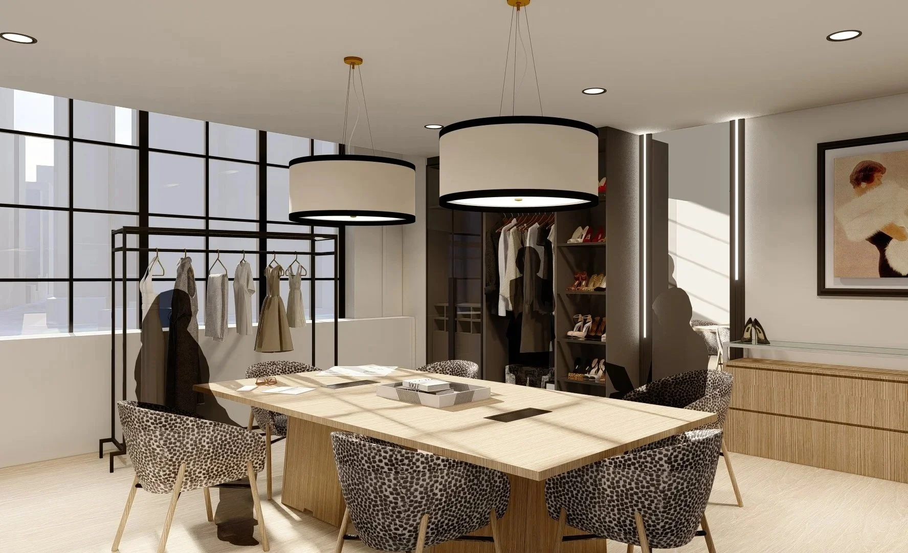 The conference rooms are equipped with Apple TV screen‑sharing capabilities, as well as front‑facing cameras that support global communication and collaboration. Vogue Chicago’s wayfinding is intentionally sleek and timeless. Each conference space is named after an influential fashion designer and features a vinyl quote on the exterior glass wall. Digital scheduling tablets outside each room indicate real‑time availability, ensuring streamlined coordination and clarity for all employees.