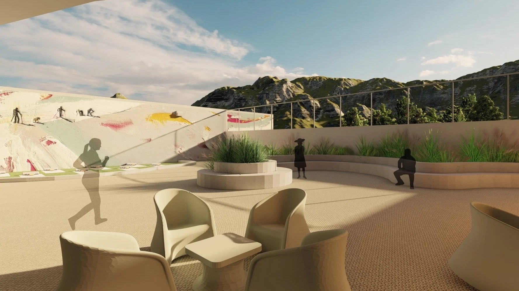 The Courtyard at Serenity Ridge offers a variety of seating options and includes a turfed area designed for staff‑guided yoga sessions, supporting stress reduction and promoting a sense of calm for patients. A mural by local artist Leslie Jorgensen spans the back Courtyard wall, depicting a mountain and its ridges—a meaningful visual representation of Serenity Ridge’s core values for patients, staff, and visitors alike.